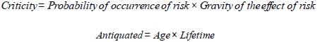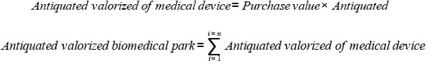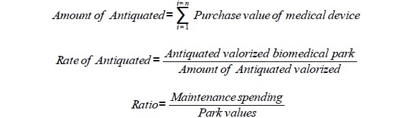 There is a set of parameters to evaluate the biomedical park such as the: i) park value ii) antiquated of each medical device iii) antiquated valorized of medical devices iv) amount of antiquated valorized, v) global antiquated of the park vi) annual drift of antiquated. The value of the biomedical park is the sum of the purchase values of each medical device. The rate of antiquated devices and the maintenance spending ratio are calculated by the formulas given in Table 6 (biomedical engineers of the Paris hospitals). The rate of antiquated is 0 if the park is new, it is 1 if all medical devices have reached their lifetime, it is greater than 1 if all medical devices have exceeded their lifetime. The rate of antiquated devices and the maintenance spending ratio were estimated for the medical specialty, biology, and imaging poles for a 500-beds hospital MSO. The rate of antiquated devices could be in the ranks from 50% to 80%. Maintenance spending ratio should be in the ranks from 4% to 10%. The values shown in Table 6 are estimates based on our hospital experience in engineering of medical devices (Table 6).