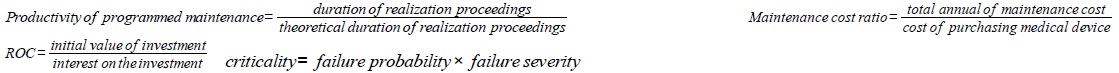 | Maintenance | Number of technical interventions and number of requests for intervention. Maintainability: reflecting the ability of medical device to be maintained in a data time. TPM: ensures the maintenance while maximizing production and involving all actors in the system. FRC: frequency of medical device failures in a data time. KPI: assessment of maintenance activity by measuring yield failures, downtime, time availability and maintainability. Productivity of programmed maintenance. Maintenance cost ratio |